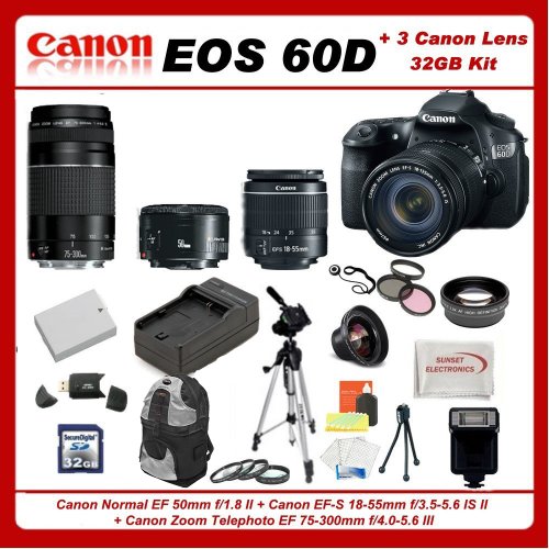 - Supposing You interested for pick up a bit of a Canon EOS 60D DSLR Camera Kit with 3 Canon lenses: Featuring Canon EF-S 18-55mm f/3.5-5.6 IS II + Canon Normal EF 50mm f/1.8 II + Canon Zoom Telephoto EF 75-300mm f/4.0-5.6 III Autofocus Lens, Also Includes: 0.45x High Definition Wide Angle Lens & 2x Telephoto HD Lens, 3 Piece Filter Kit & 4 Piece Macro Lens Kit, Extra LE-E6 Replacement Battery & Travel Charger, 32GB SDHC Memory Card & Reader, Deluxe Backpack, Dedicated Flash and Much More... of your time frame discounts , The client may also trial to see upwards of tip approximately collections details , specification or verbal description.